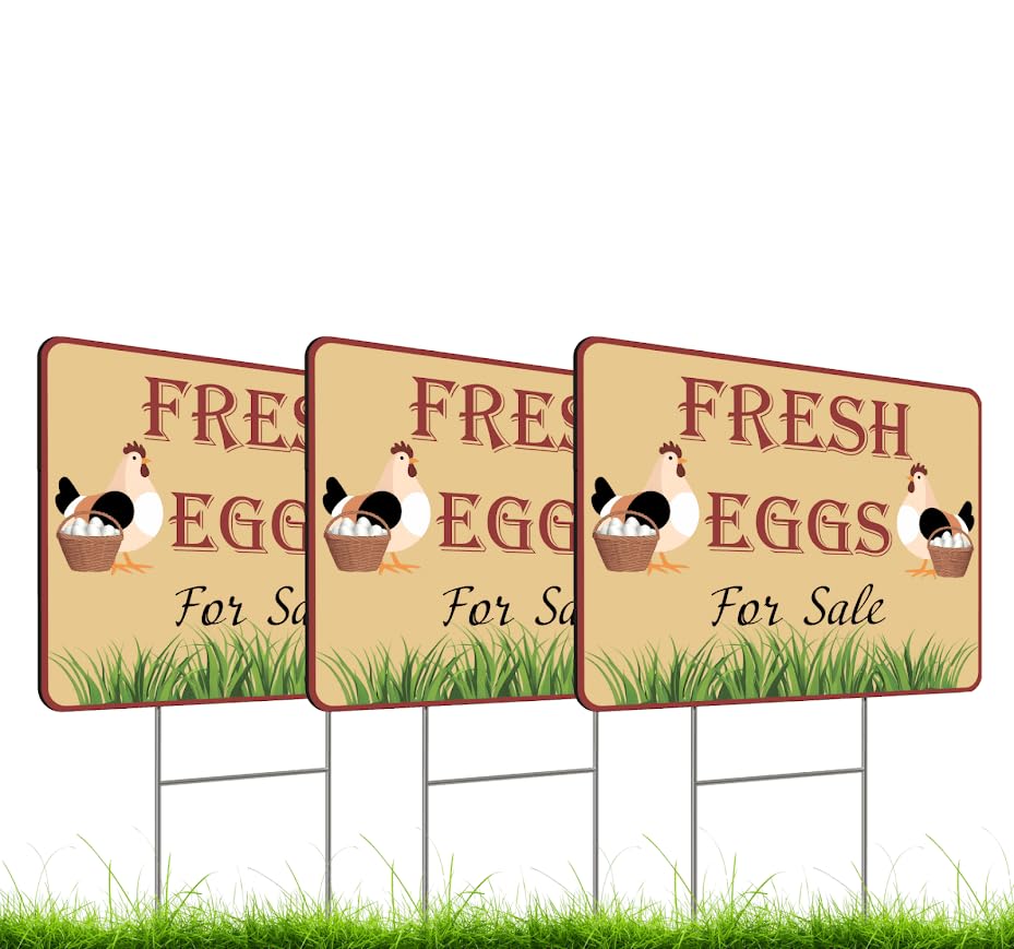 Set of 3 Double Sided 12x16 Inches Fresh Eggs For Sale Sign with Metal H-Stakes - Plastic Sign Fresh or Egg Sign for Outdoor and Indoor - Fresh Chicken Eggs For Sale Yard Sign