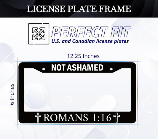 6x12.25 Inch License Plate Frame with Quote Not Ashamed. Romans 1:16" for Standard USA Cars - Aluminium Frames with 2 Holes and Screws - Christians Frames for Your Car Accessory Driver