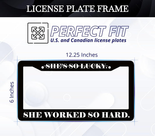 6x12.25 inches Black License Plate Frame with Quote She's So Lucky. She Worked So Hard with 2 Holes and Screws - Standard Cars USA Frame for Front or Rear - Aluminium Plate Frames Car Accessories