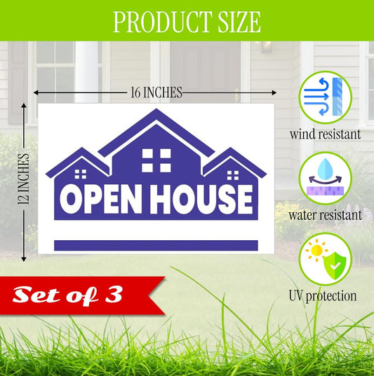 3X Double Sided 12x16 Open House Sign for Real Estate Agent Supplies for Sale Plastic Signs with H Wire Stakes - Realtor Supplies for Sent Houses for Sale Yard Sign - Moving Sale Directional Signs Kit