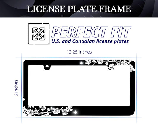Floral Black White Cherry Blossoms License Plate Frame for US Standard - Flowers License Plate Frames Stainless Steel - Auto Parts Decorative 6x12.25 inch Plate Frame with 2 Holes and Screws