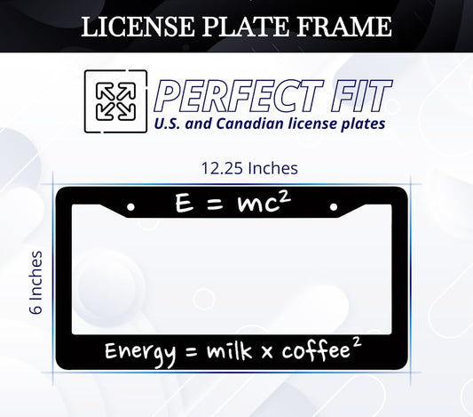 6x12.25 Inch Personalized Black License Plate Frame with Quote Energy = Milk x Coffee - Funny Front License Plate Frames Designs with 2 Standard Slotted Mounting Holes - Aluminium Frames for Auto