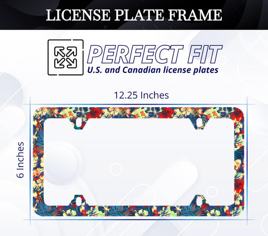 License Plate Frame 6x12.25 Inches - Color Blue Tropical with Flowers with 4 Standard Slotted Mounting Holes - Stainless Steel Unusual Accessories for Your Car - Decorated Frames for Your Number
