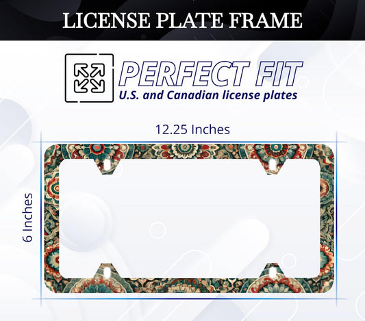 License Plate Frame for US Standard Frame 6x12.25 Inch - Vintage Style with Mandala Flowers with 4 Holes and Screws - Boho Style License Plate Frames of Your Number