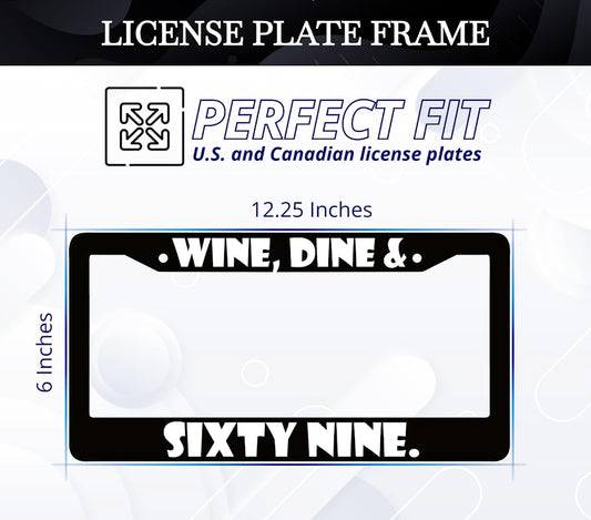 6x12.25 inches Personalized Car License Plate Frame for USA Standard Wine, Dine & Sixty Nine - Aluminium License Plate Frame for Car Universal Accessories - Plates Frames with 2 Holes and Screws