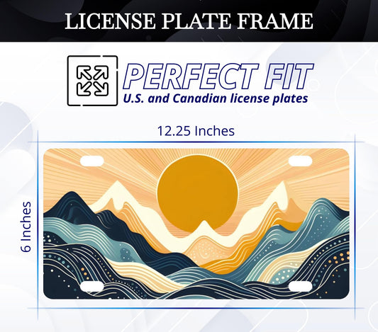 Decorative Retro Sunset/Sunrise Waves Front License Plate Frame - Accessories Decorative Sun Art License Plate Frame Front Tag - Car Sun and Waves Front Design with 4 Standard Slotted Mounting Holes