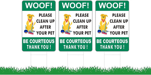 3X Double Sided 12x8 Please Clean Up After Your Pet Sign - Lawn Fun Pet Plastic Signs - Collect Dog Poo and Don't Wet Also No Dog Poo for the Yard - Signs to Curb Your Dog with Metal H-Shaped Stakes