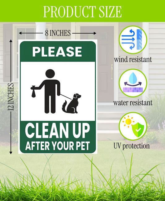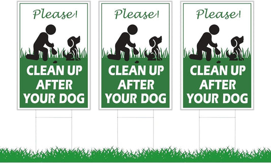 3X Plastic Double Sided Please Clean Up After Your Pet - 12x8 Inch Signs with H-shaped Front Yard Stakes - Pet Signs on the Yard Lawn - Collect Dog Poop and Don't Wet the Lawn - Signs To Curb Your Dog