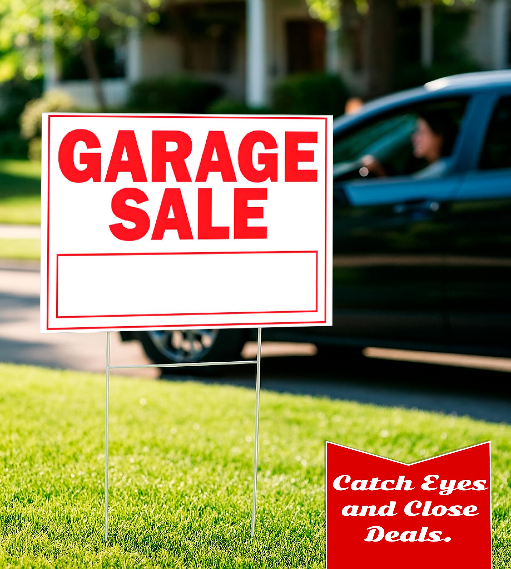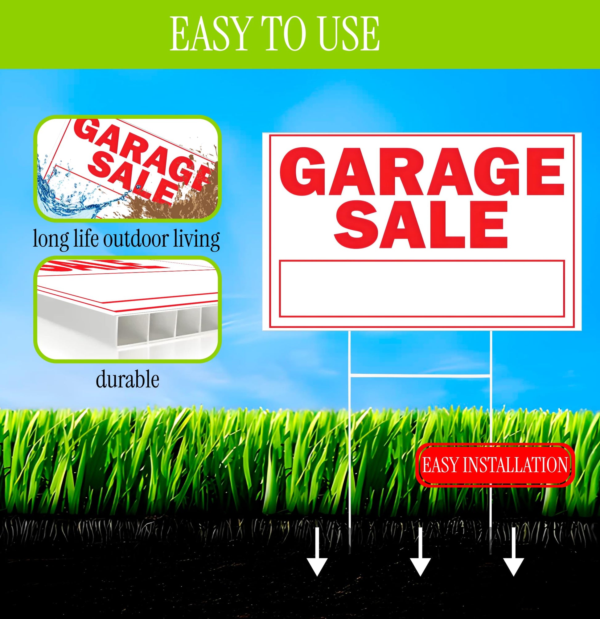 - Corrugated plastic signs, yard signs with 12x8 lawn stakes and signs for the outdoor yard. Waterproof signs for sale from the owner in the garage are single-sided or a blank sale sign with an arrow.