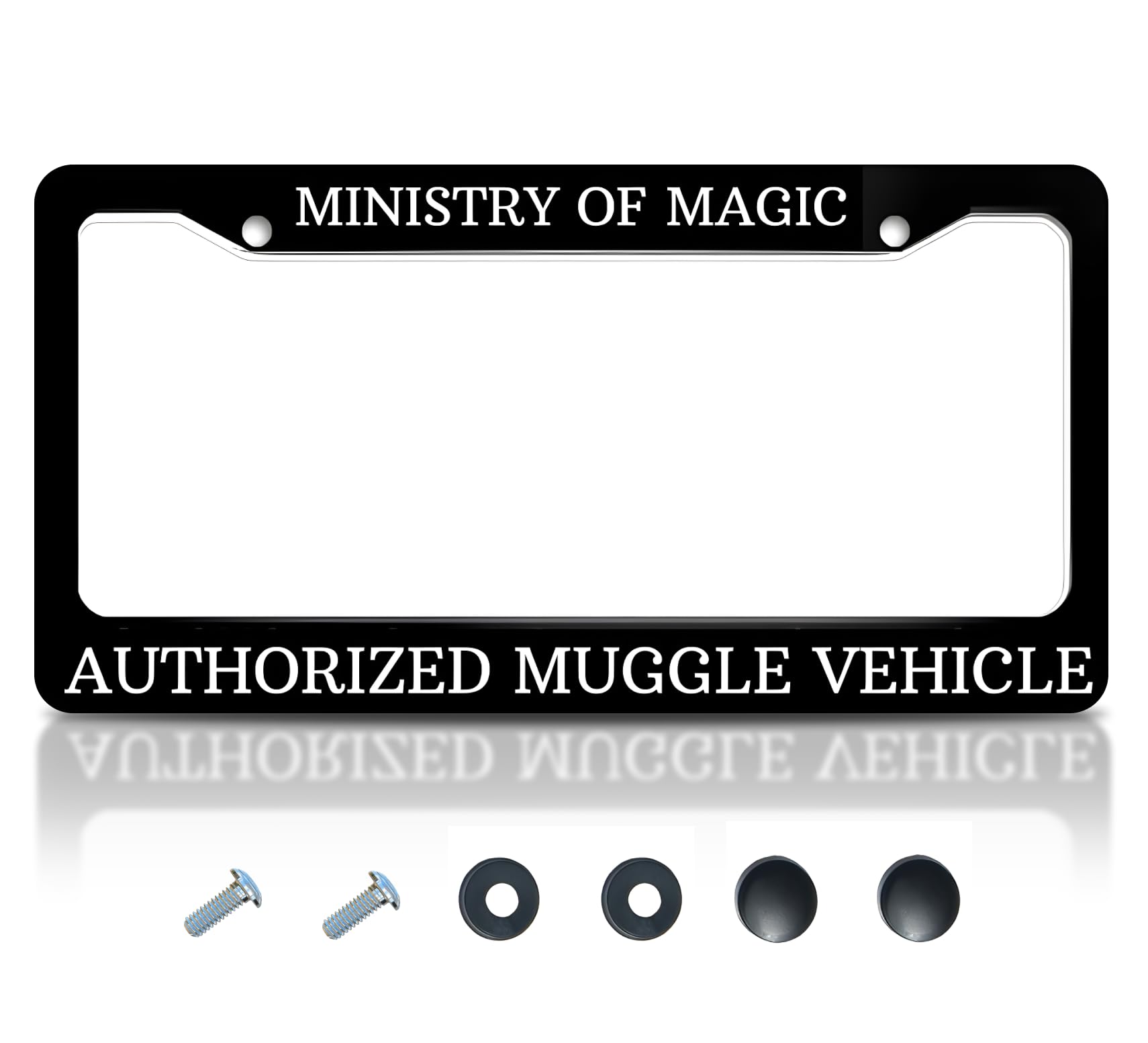6x12.25 Inch Personalized License Plate Frame Ministry of Magic Authorized Muggle Vehicle - Metal Black Car Frames with 2 Holes and Screws - Standart Cars USA Frame for Front and Rear