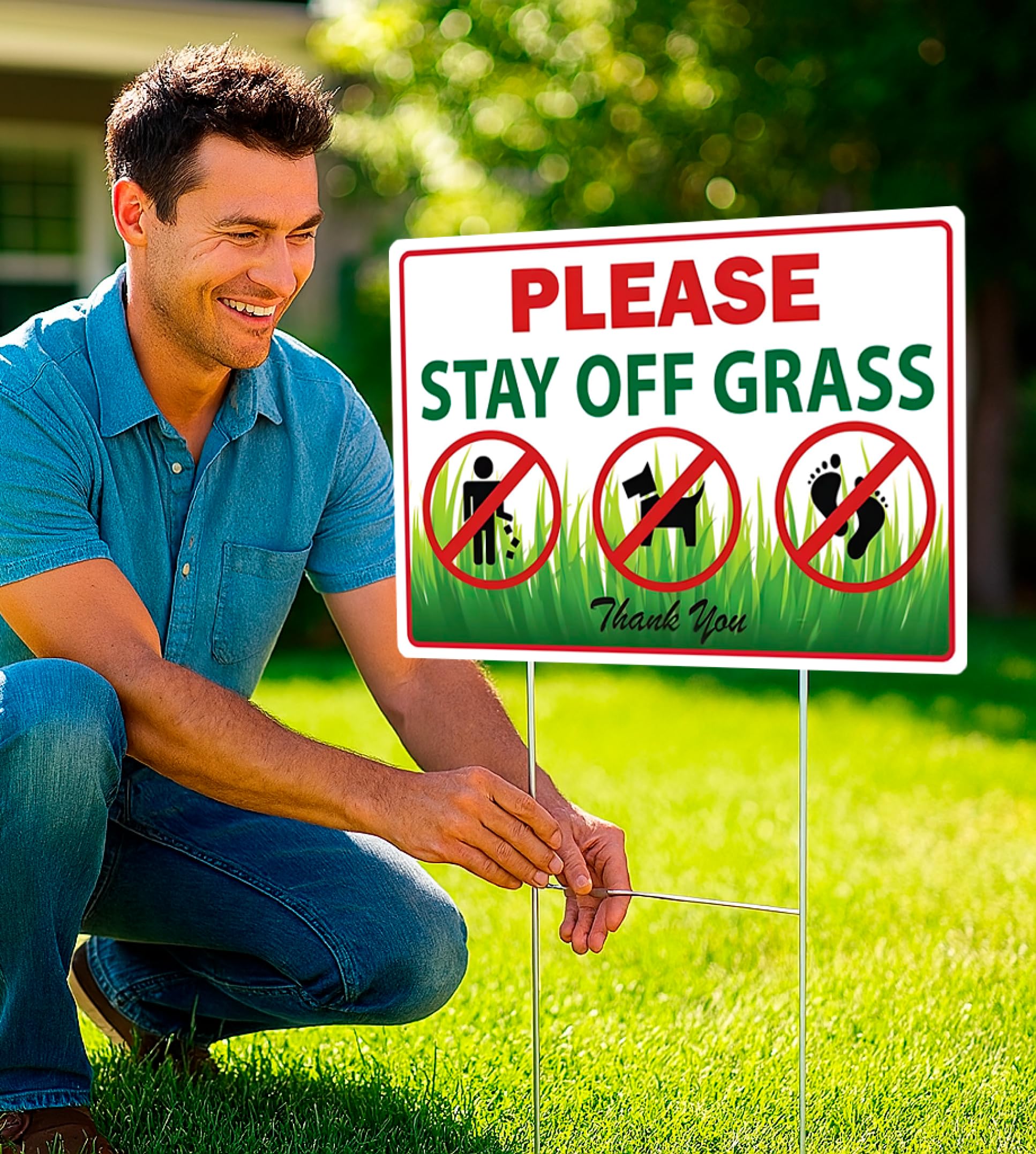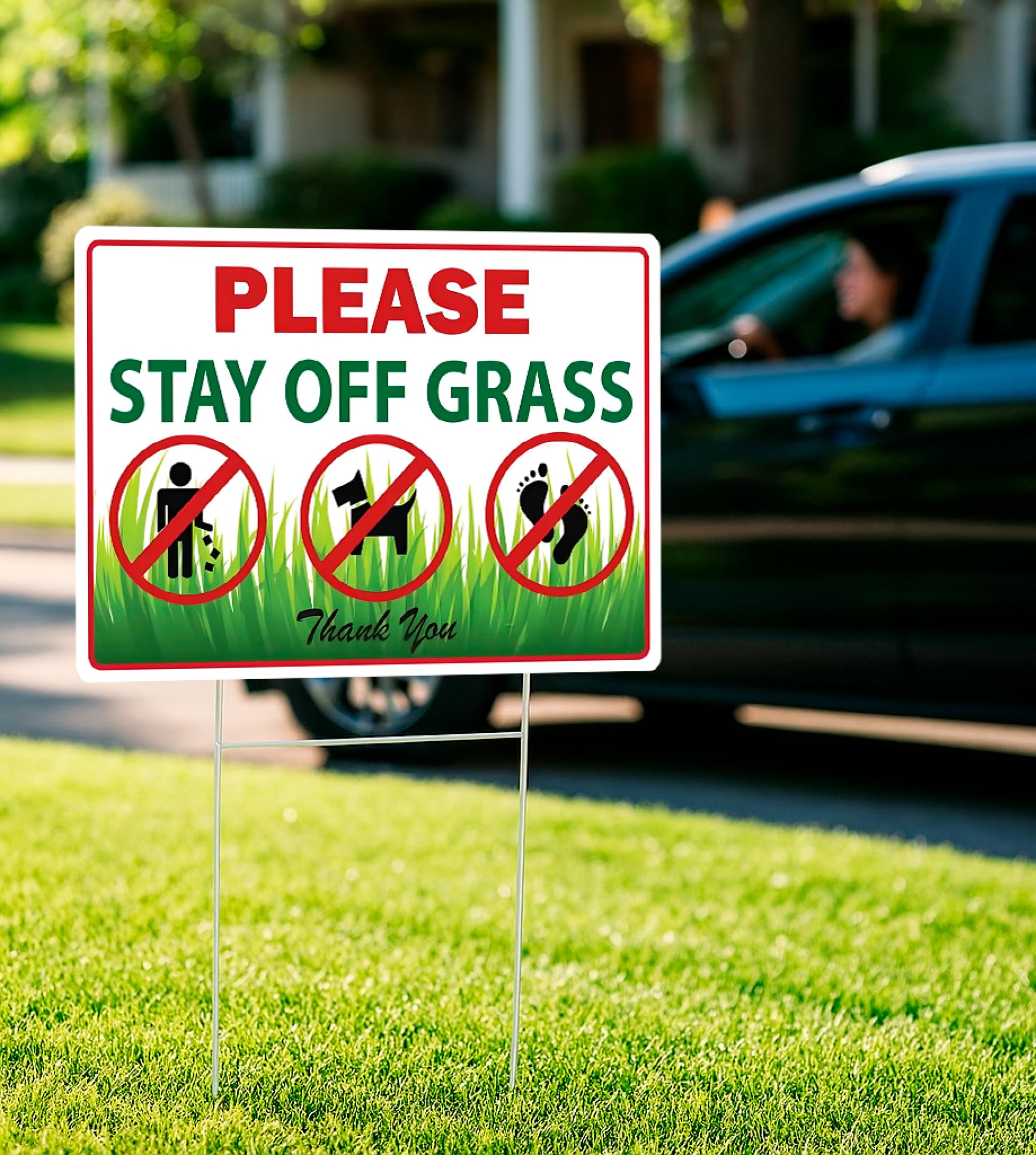 - Private property - please stay off grass, Includes 3 piece 8x12 inch no parking signs with H-metal stakes. Stay off grass sign with stake easy to insert into the ground. Waterproof and wind Resistant.