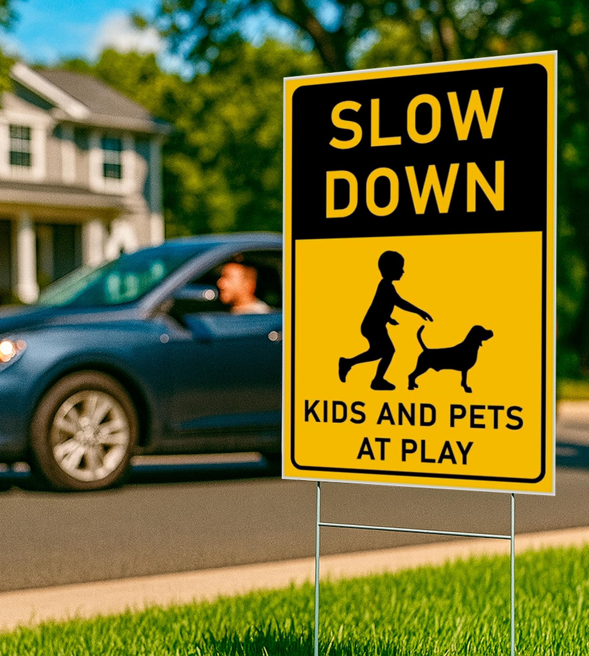 - "Slow Down Kids and Pets at Play" - your speed sign. Stop/slow signs traffic double sided: slow down kids live here cat crossing sign, funny slow down signs for neighborhoods.