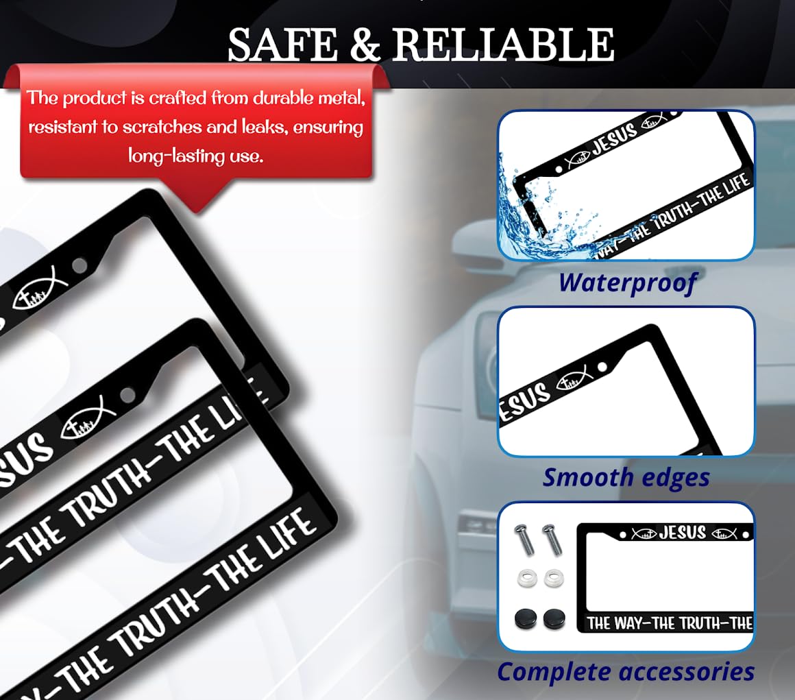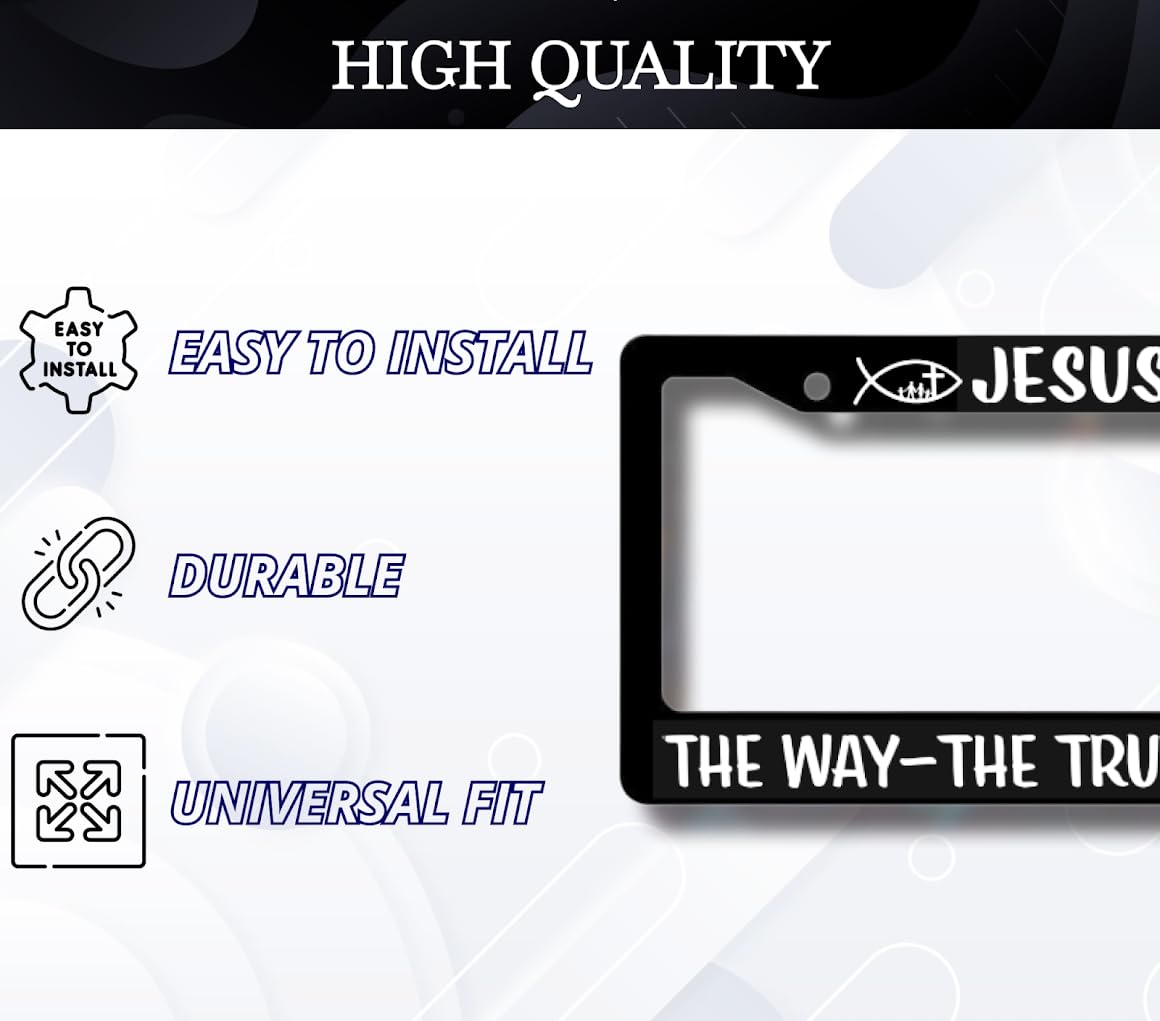 Black Car License Plate Frame 6x12.25 Inch - Stainless Steel Frame - for US Standard License Plate Jesus The Way The Truth The Life Christian - Religious Frame with 2 Holes and Screws