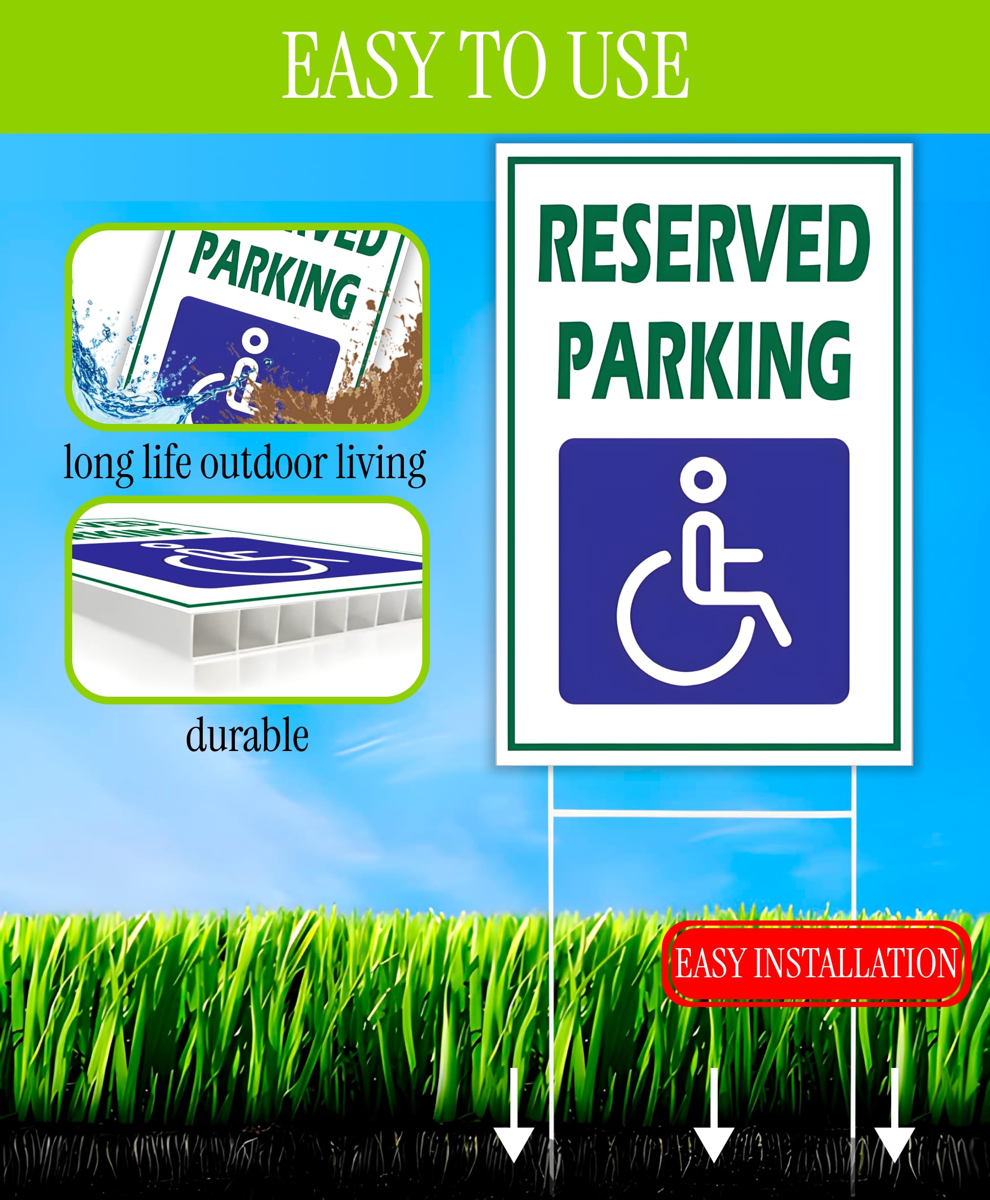 - Reserved parking sign, ideal for your lot, front yard, lawn, garden, or any area with grass! Plastic reserved parking with picture of wheelchair sign for playgrounds, yards, businesses, strip malls.