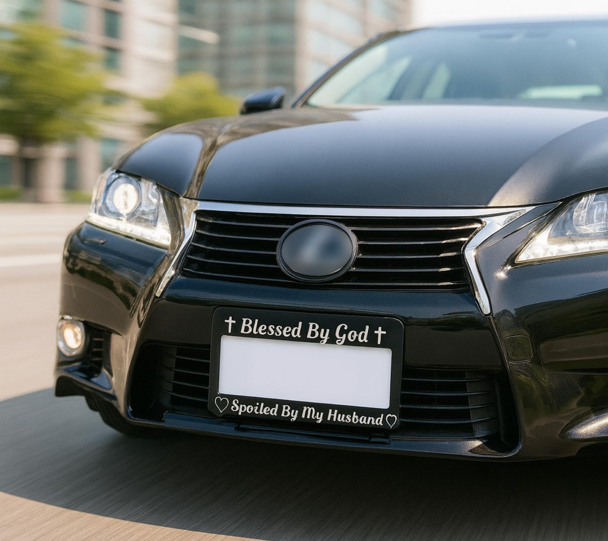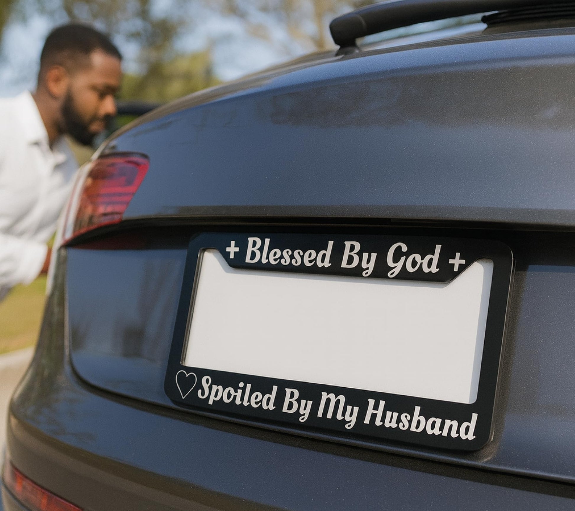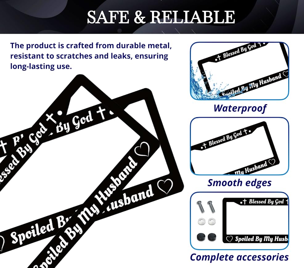 Personalized Car License Plate Frame for US Standard Frame Blessed by God Spoiled by My Husband - Black Metal Plate Frame 6x12.25 inch - Aluminum Car with 2 Holes and Screws
