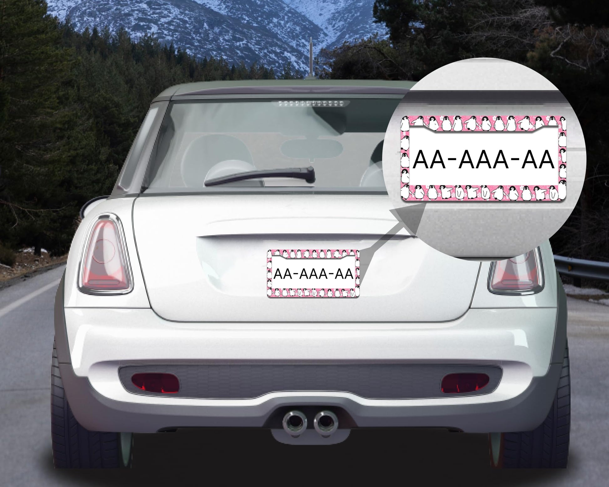 Personalized Car License Plate Frame - Stainless Steel Plate Frame with Screws 6 x 12.25 inches and 2 Holes and Screws - Pink Frame with Penguin for Women - Metal Car Universal Accessories