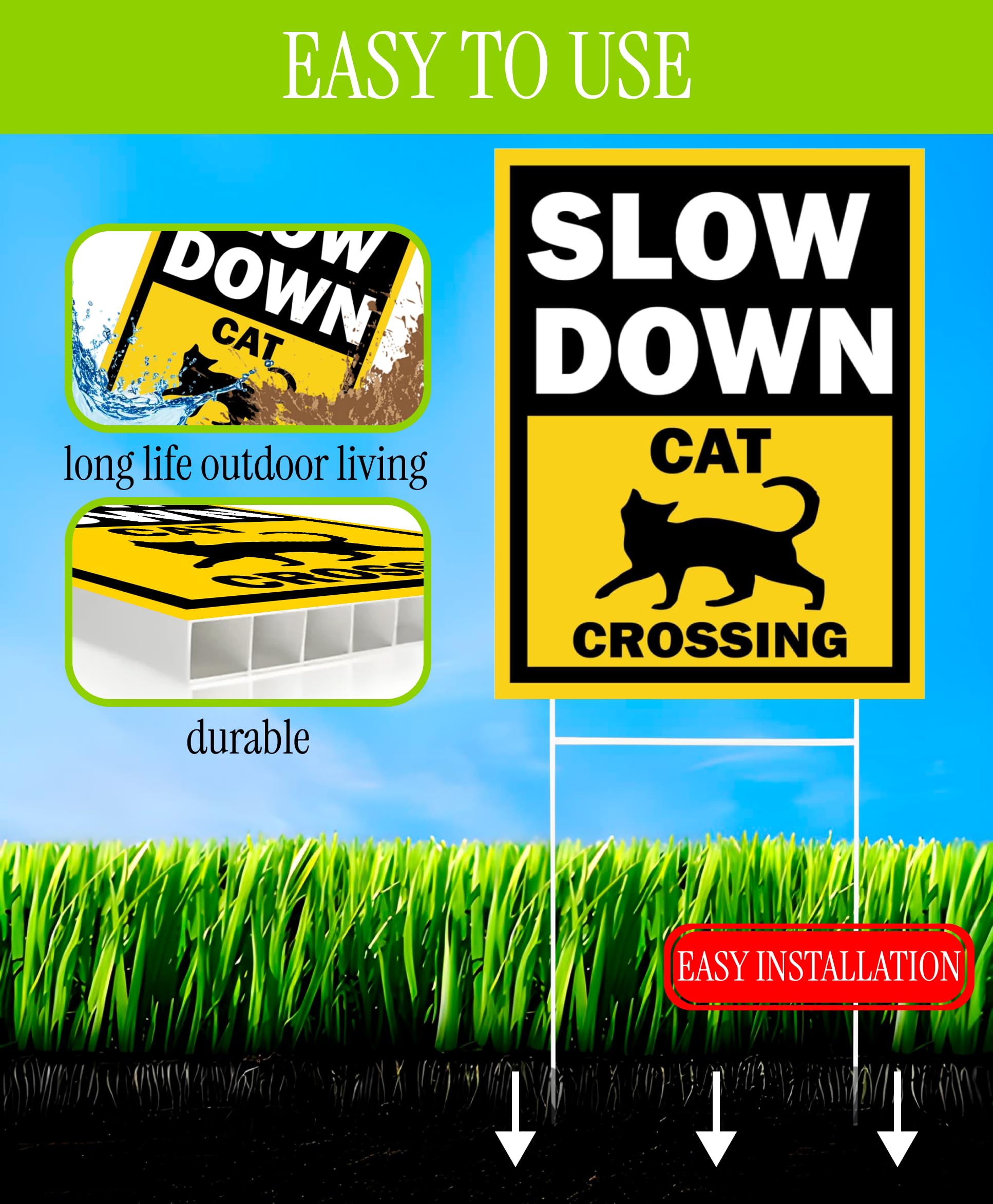 - Safety slow down cat crossing signs for sidewalks, yards and driveways with H Stakes: drive like your pets live here yard sign, caution cat crossing stand up sign for neighborhood street outside use.