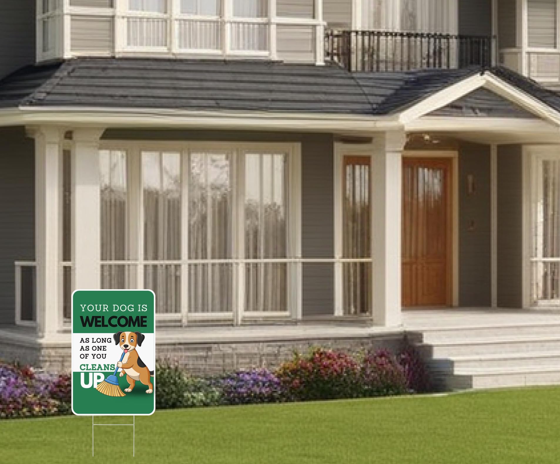 - This funny clean up after your dog yard sign or dog welcome as long as one of you cleans up sign ideal for playgrounds, common areas, yards, businesses, strip malls and etc.