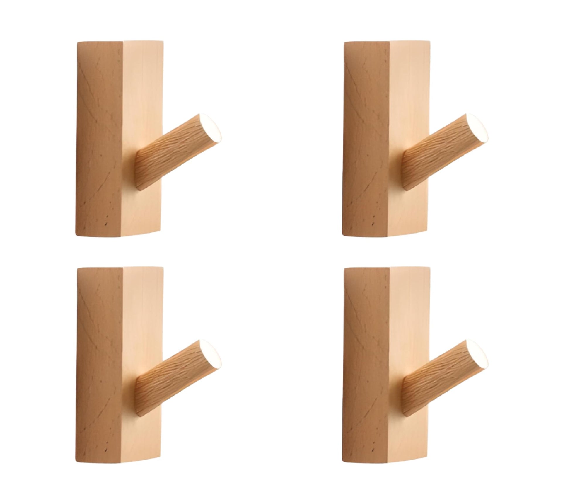 ULVEOL Set of 4 Rustic Wooden Wall Hooks - Heavy Duty Adhesive Coat Hooks for Towels, Hats, Coats & More - Beech Wood, 15kg Capacity